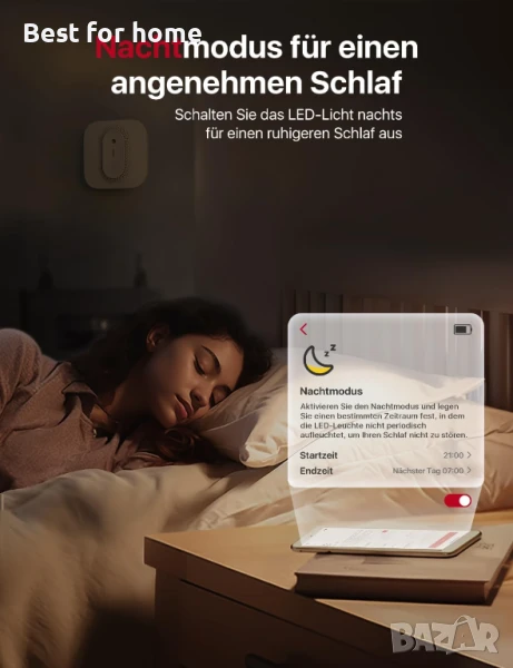 Нощен режим: задайте персонализирани часове за изключване на зелената светлина, за да можете да спите спокойно, без да ви смущават източниците на светлина; Нощният режим не влияе на работата на алармата.