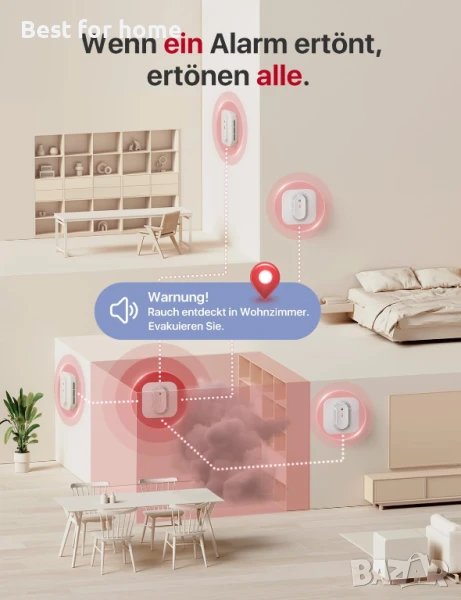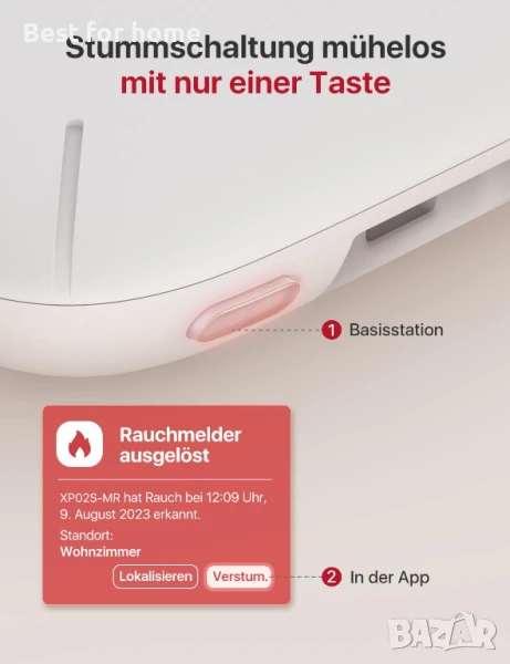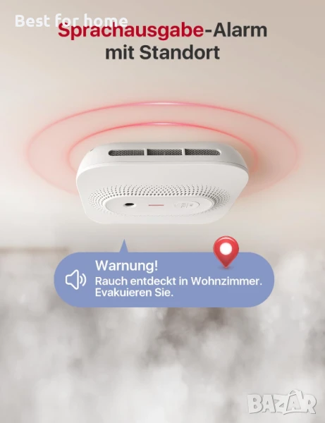 Гласова аларма с местоположение: В случай на образуване на дим, интелигентна гласова аларма ви информира за инцидента на немски език, например „Внимание! Дим в хола. Напуснете зоната“. Това е по-безопасно за децата, тъй като те реагират по-бързо на човешки гласове, според проучвания. Налични са 17 предварително програмирани местоположения. (Не поддържа други езици)