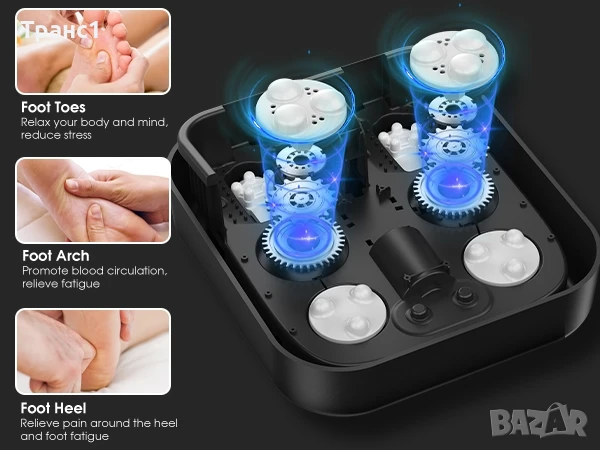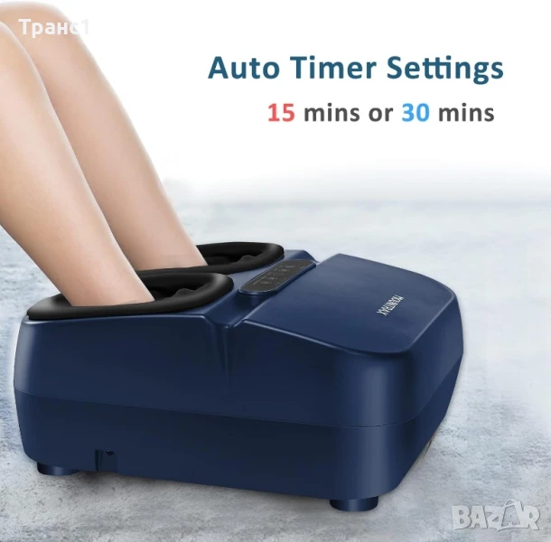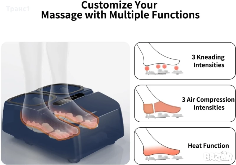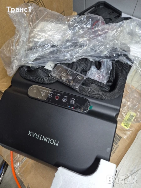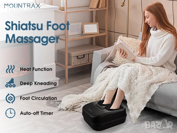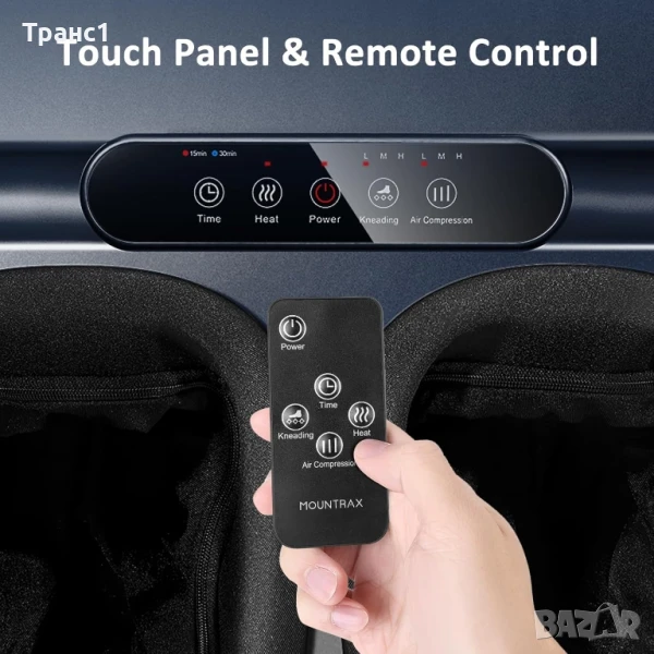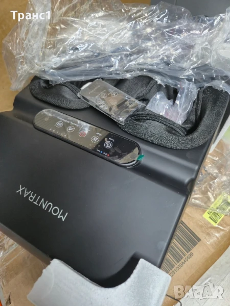 MOUNTRAXПрофесионален Шиацу масжор с въздушна компресия и топлина .Масажорът за крака Mountrax има сензорен панел и дистанционно управление и изключително луксозен външен вид!Насладете се на професионален шиацу масаж с Mountrax. Той е оборудван с две независими въртящи се глави с множество ергономични малки масажни глави, за да масажирате повече зони на стъпалото си за подобрен шиацу масаж. Пълно покритие с въздушна компресия ви позволява да изпитате дълбоко месене и стискане. Позволява ви да се отпуснете напълно след натоварен ден и да облекчите уморените мускули.Девет режима на персонализиране: Три интензитета на месене и три интензитета на въздушна компресия могат да се регулират според личните предпочитания. Моля, започнете от ниска интензивност. Ако усещате, че стискането е твърде слабо по време на употреба, можете да регулирате въздушната компресия на средна или висока интензивност, за да получите по-силен ефект на стискане. Дълбокият масаж с месене намалява сковаността на мускулите, отпуска мускулната тъкан и осигурява отлично масажно изживяване.Опционално отопление: Може да се включва и изключва поотделно. Функцията за отопление може да ви държи топли, докато се наслаждавате на масажора за крака, подобрявайки кръвообращението. Топлината, която осигурява, е безопасна за кожата и е изключително комфортна, особено през студеното време. Или можете да изберете да изключите функцията за отопление в горещи дни.