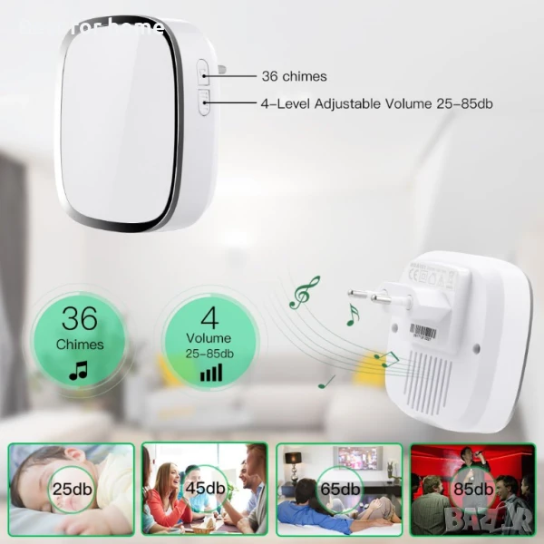 Безжичният звънец е лесен за употреба. Могат да се поставят два приемника навсякъде, никога няма да пропуснете посетителя си.