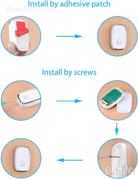 [Лесен монтаж] Не е необходимо окабеляване. Просто включете външния безжичен приемник за звънец в електрически контакт и монтирайте бутона с включената двустранна лента и винтове. Включен е шаблон за пробиване на места за винтове, ако решите да пробиете отвори за монтаж на бутона.