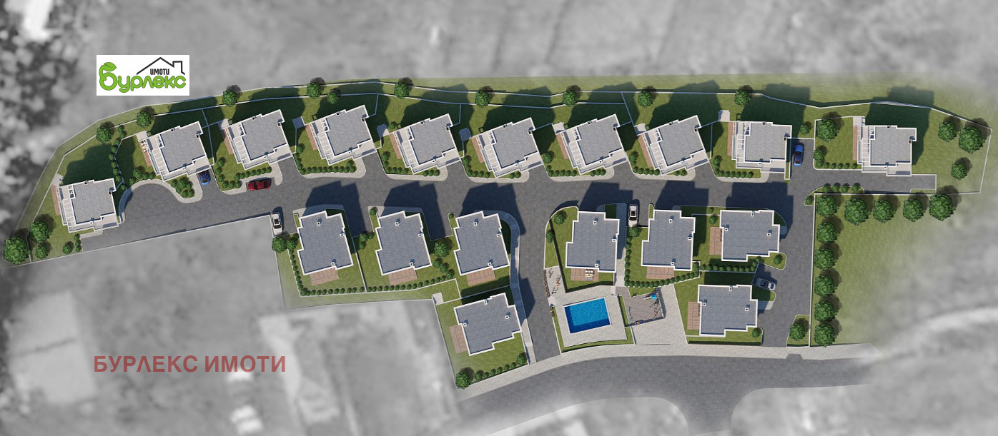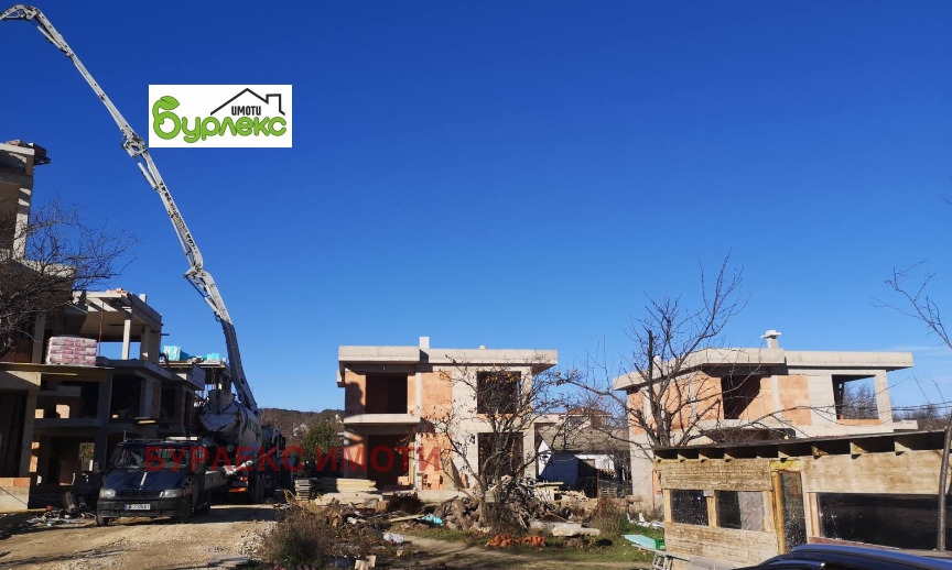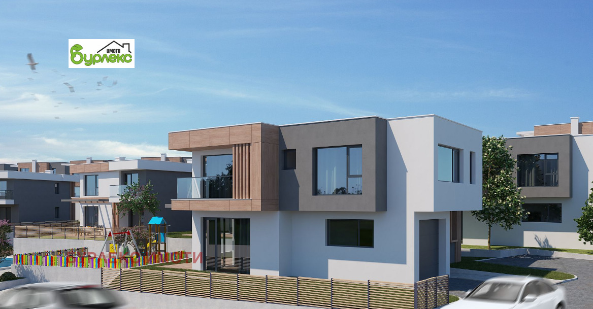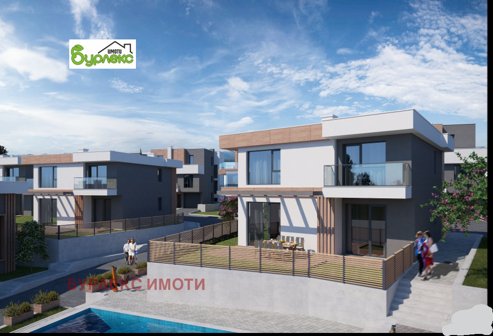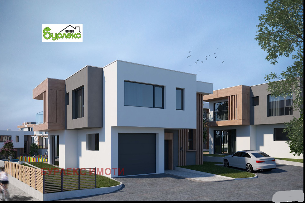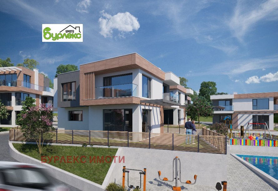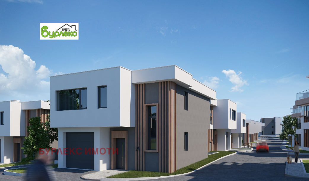 БУРЛЕКС ИМОТИ представя на Вашето внимание страхотна луксозна двуетажна къща.Разположена в затворен комплекс, състоящ се от шест двуетажни и десет триетажни къщи, сред живописна природа с красива гледка в местност Горна Трака.Къщата е с РЗП 217 кв.м. и има следното разпределение: първият етаж със застроена площ 95,4 кв.м. се състои от входно антре, просторна дневна с кухненски бокс /46 кв.м./, килер /5 кв.м./, тоалетна /3,3 кв.м./ и гараж. Вътрешно стълбище води до втория етаж, който включва три големи спални /17,3 кв.м., 18,7 кв.м. и 18,4 кв.м./, две от които с излаз на балкон /съответно 4,3 кв.м. и 6,8 кв.м./, дрешник /7 кв.м./, коридор и две бани с тоалетни /6,8 кв.м. и 5,9 кв.м./. Изложението е югоизток.