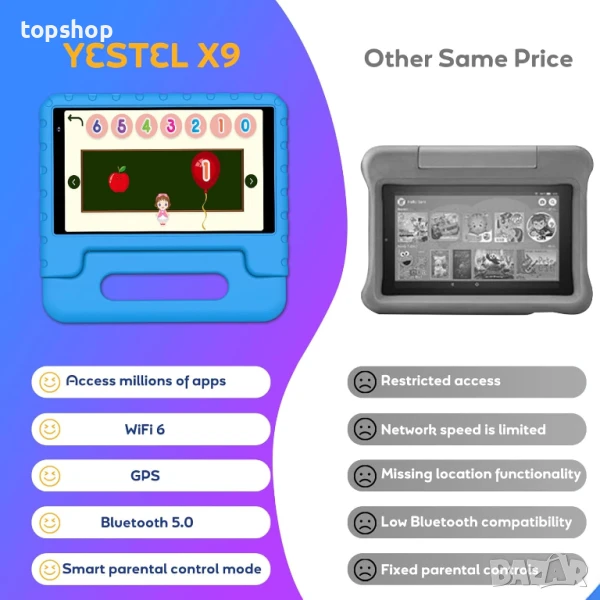 Въртящ се EVA калъф: удароустойчивият калъф на детския таблет X9 е изработен от висококачествен, екологичен EVA материал, който осигурява перфектна защита срещу случайни падания, драскотини, удари и прах и се предлага с протектор за екрана, за да се предотвратят надрасквания по него. Въртящата се и сгъваема стойка осигурява множество ъгли за максимален комфорт за вашето дете, независимо дали става въпрос за видеоклипове или за носене в движение.