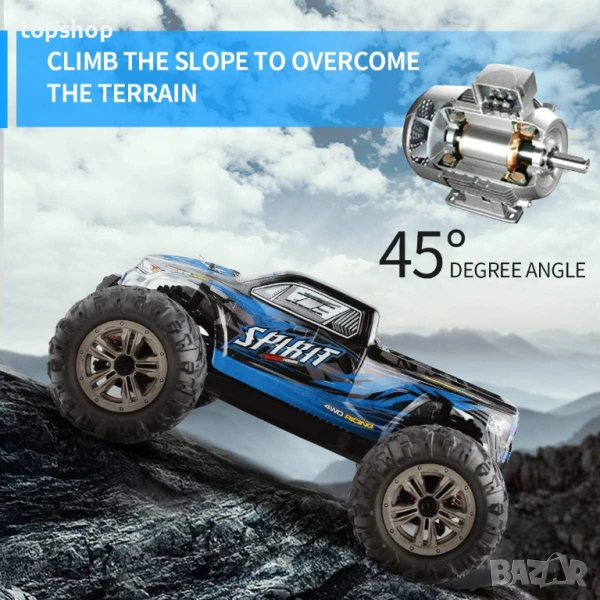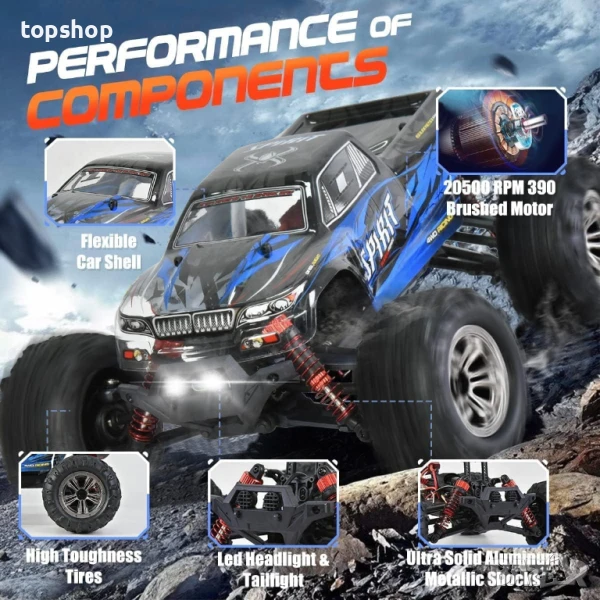 【Стабилна конструкция и задвижване на 4 колела】--- Силната мощност го прави лесен за шофиране по неравни пътища или извън пътя, без това да влияе на производителността му. Супер здравата конструкция против сблъсък и задвижването на 4 колела правят възможно шофирането по всякакви пътни условия, без да се забивате в по-големи препятствия по пътя.