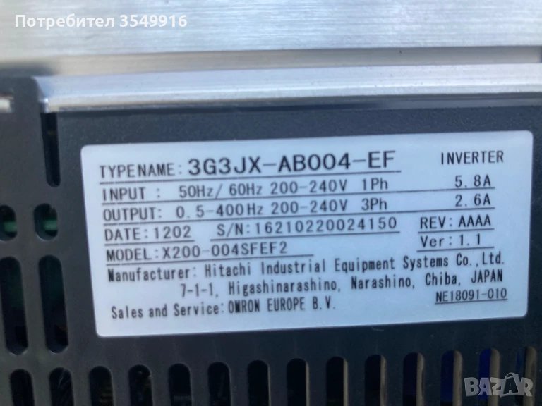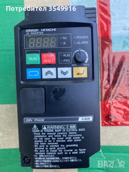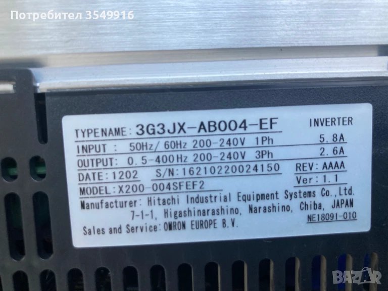 Честорен регулаторт модел 3G3JX-AB004-EF 0,4 KW Вход 1PH 220/240V +/- 10% 50/60Hz 5,8A Изход 3PH 0-240V 0/200Hz 2,6А Състояние-използвано в отлично състояние.