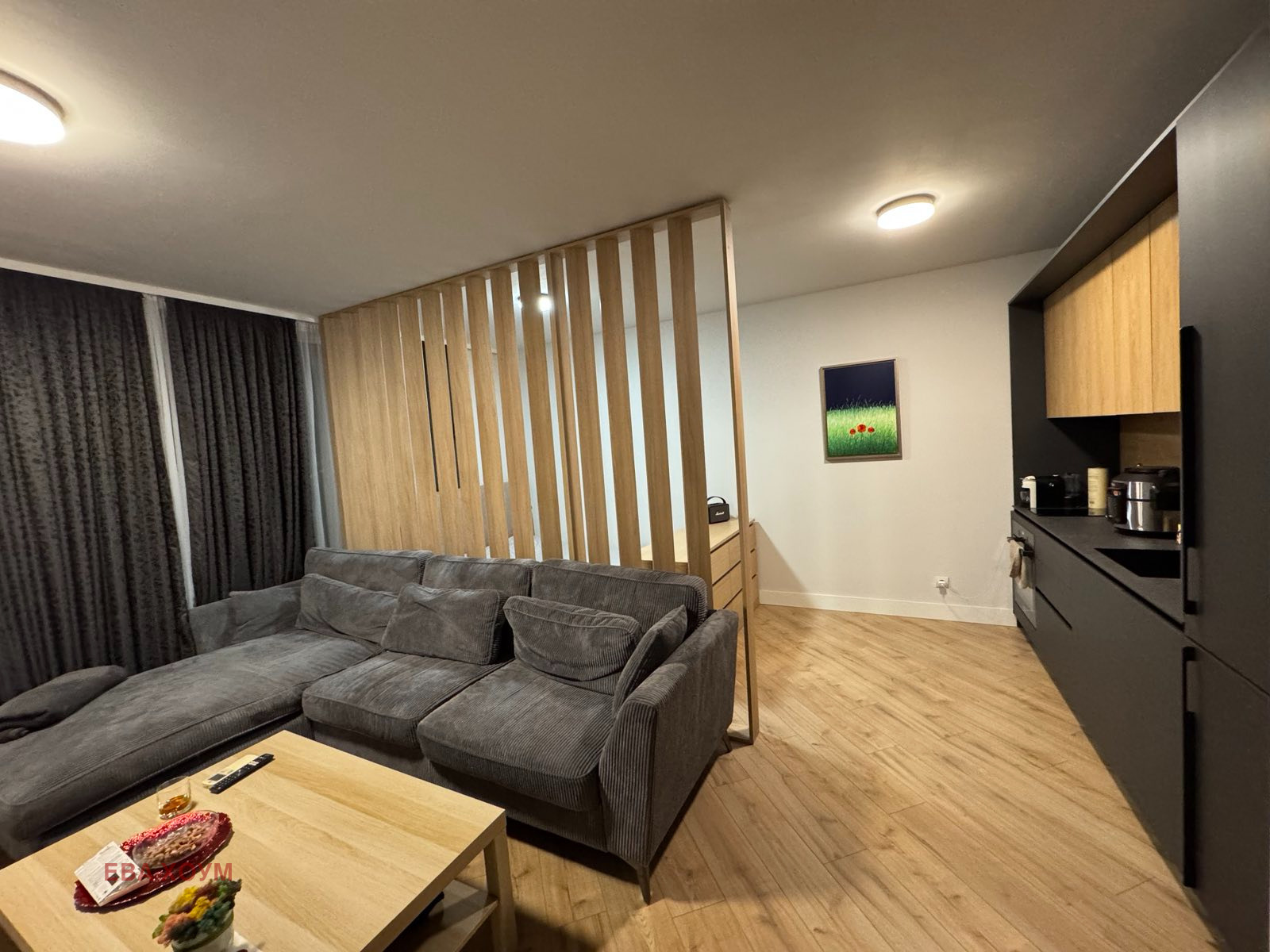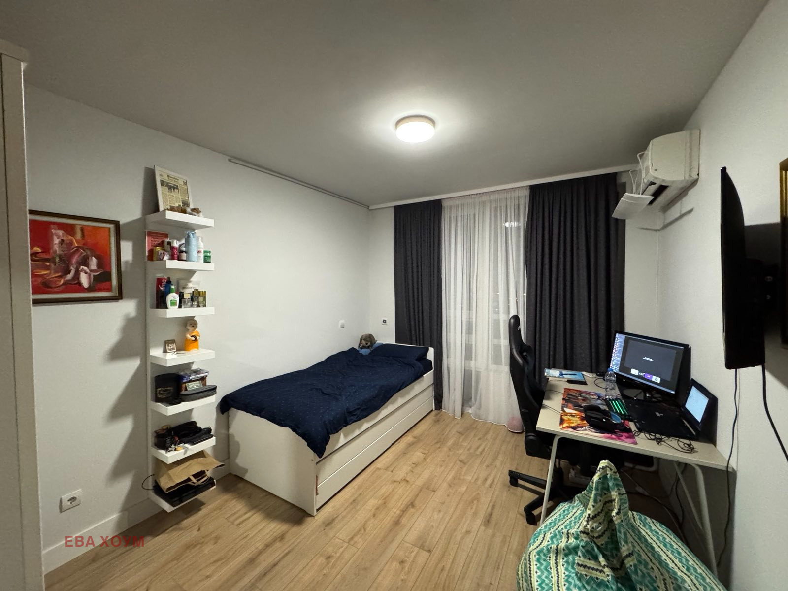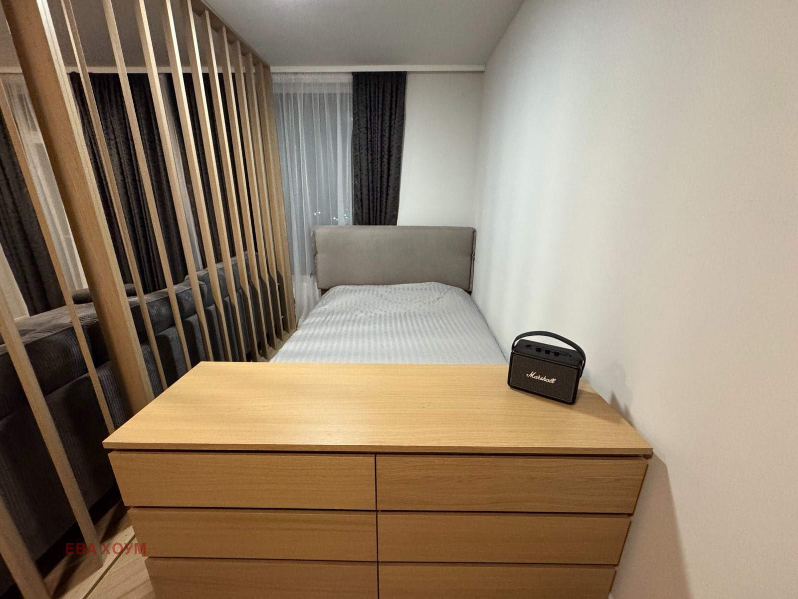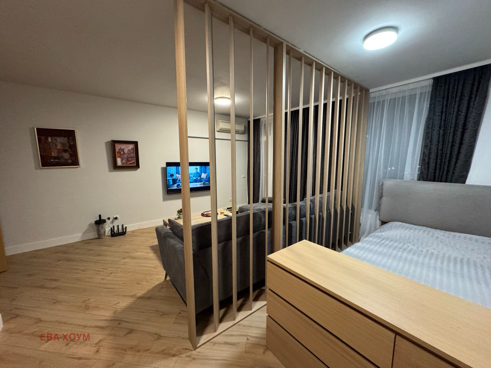 EVA home предлага двустаен апартамент в сграда с луксозни общи части модерно обзаведен състоящ се хол с кухня и спалня, детска, баня и тоалетна, коридор и тераса с южно изложение!