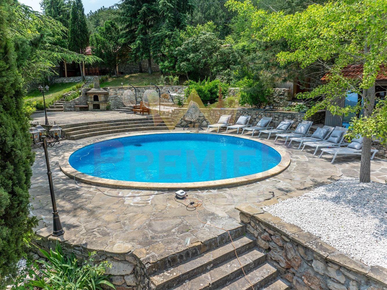 Теренът е оформен с внимание към всеки детайл истински парк с много кътове за отдих, сенчести зони и пътеки, които водят до различни части от имота:
