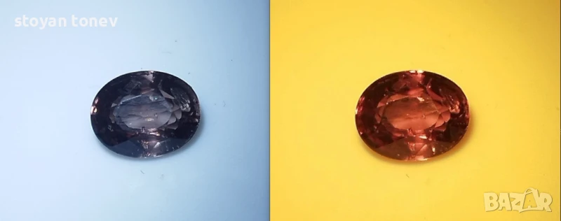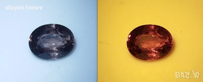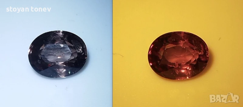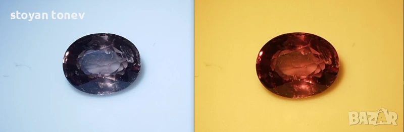 Шеметна промяна на цвета предлага този гранат от Масаси, Танзания - район известен с едни от най-качествените и редки кристали. От изискано спокойни тонове поставен на жълта осветление направо запламтява отвътре с качествено нови цветове. Радък и впечатляващ.