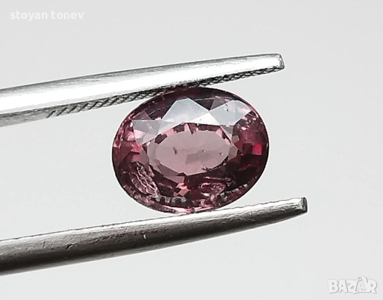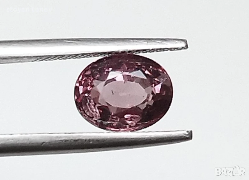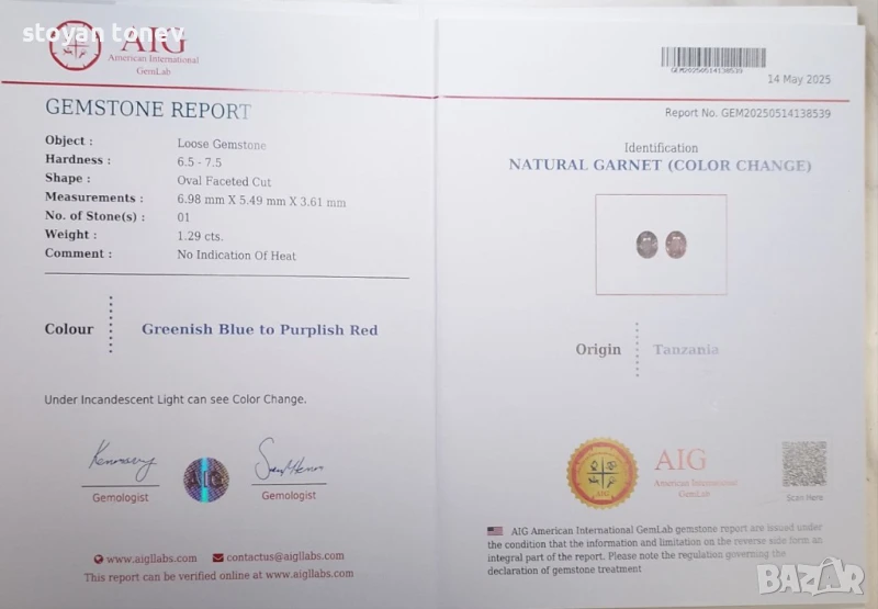 гранат с тегло 1.29кт. и произход Масаси, Танзания. Чистота VS с минимални видими включения. Двуцветен: от зелено синьо към лилавеещо червено при жълто осветление. Класическа овална форма с размери: 6.98 x 5.49 x 3.61 mm.