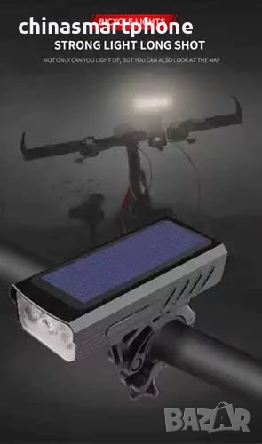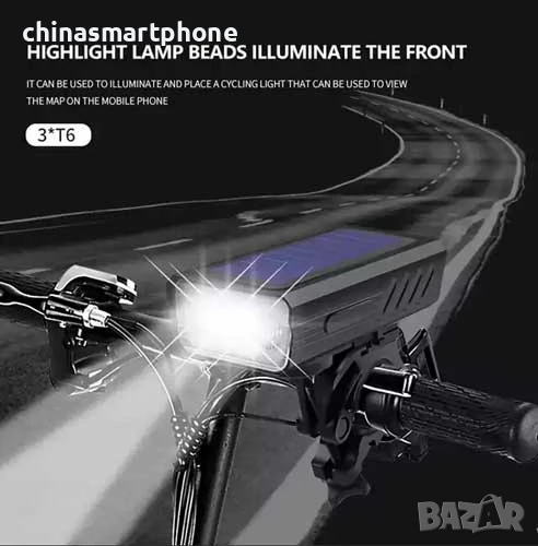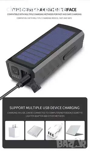 💥 Комбиниран фар и клаксон с 7 режима на звукова сигнализация и 6 светлинни режима. Зарежда се чрез USB и слънчева енергия.