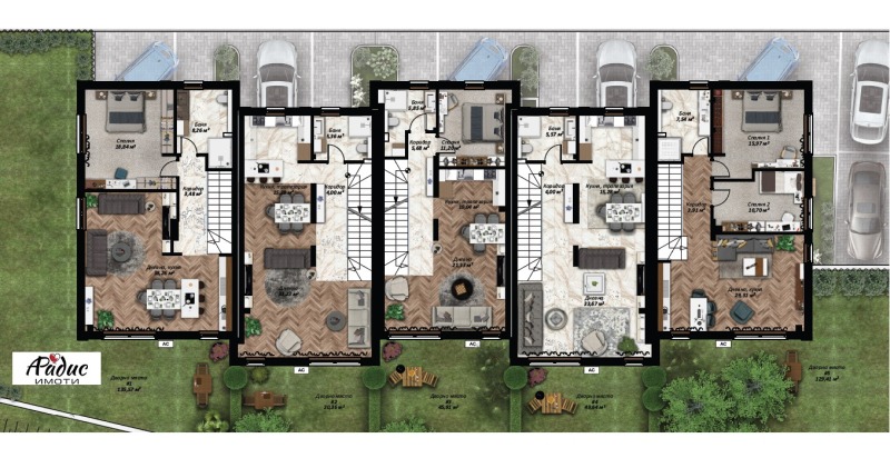 Комплексът се състои от 5 луксозни еднофамилни къщи, всяка изградена върху самостоятелен парцел. Към всяка от къщите има дворно пространство, разполагат с паркоместа или гараж. Къщите са с разгъната застроена площ от 200,45кв.м.,193,67кв.м. и 199,92кв.м. , функционално проектирана и разпределена по начин, целящ постигане на максимален комфорт и качество на живот. Елегантните фасади , високите тавани, просторни спални със собствени бани, обширните дневни с прилежащи трапезарии, слънчевите, професионално озеленени дворове и безупречно качество на изпълнение са само малка част от това, което прави този имот специален.