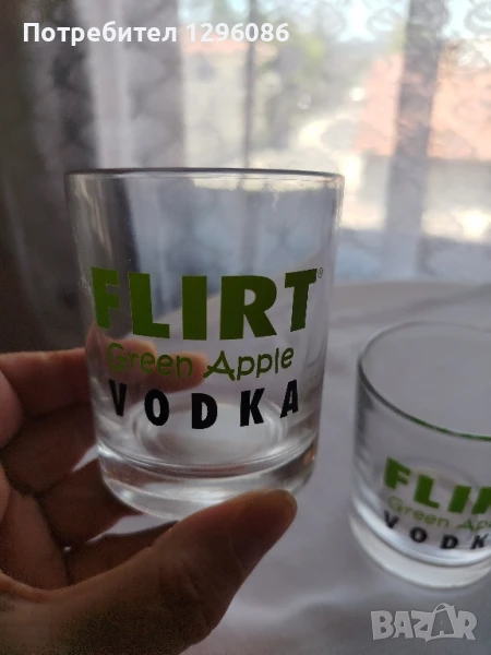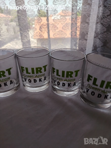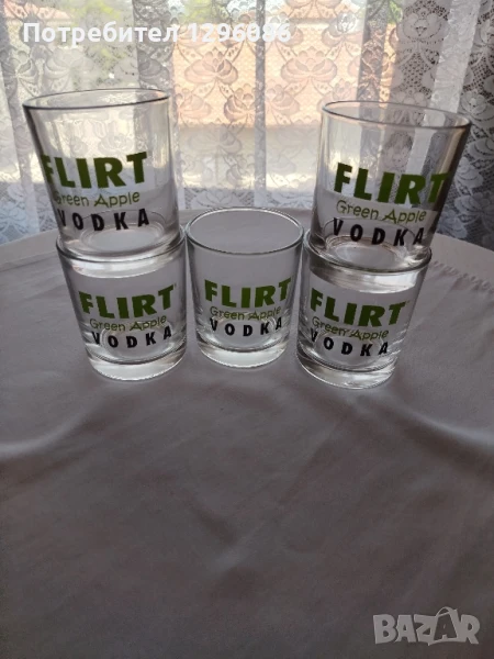 Чаши с надпис Флирт за водка.5 бр са чашите и затова са на тази цена.Използвани са.