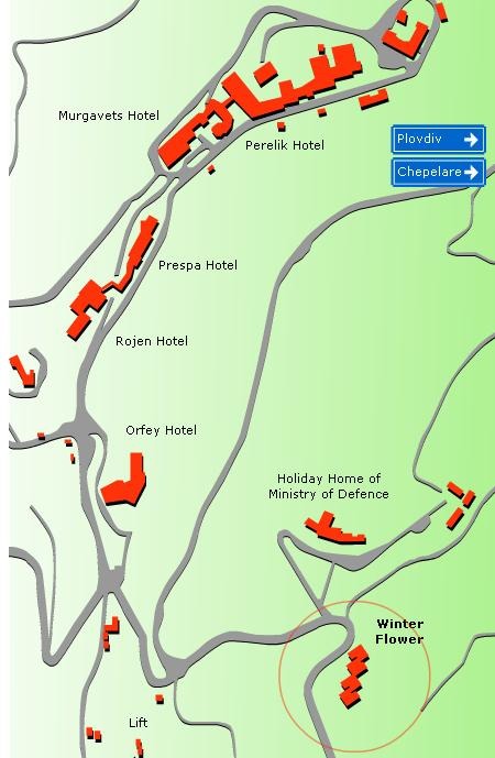 Местоположение: в сърцето на Родопите в к.к.Пампорово, който е най-южният европейски ски-курорт. Намира в средните части на планината Родопи, на 260 км. от столицата на България - гр. София. Отдалечен е на 85 км. от втория по големина град в България - Пловдив (градът разполага с летище) и само на 12 км. от областния център на Родопите - гр. Смолян. Една от най-характерните особености на този планински курорт е голямото пространство, върху което е разположен, както и запазената иглолистна растителност. Климата: Слънчевата перла на българските планински курорти. Курортът е разположен на 1650 м. надморска височина, в подножието на връх Снежанка (1926м.). Климатът е мек, със средиземноморско влияние. Средната годишна темепература е 8.5 градуса С. Снежната покривка се задържа над 150 дни в годината, като дебелината й е 140-150 см. Пампорово е комплексът с най-много слънчеви дни в годината - до 270 дни годишно. За региона не са характерни резки промени на времето и лавини.