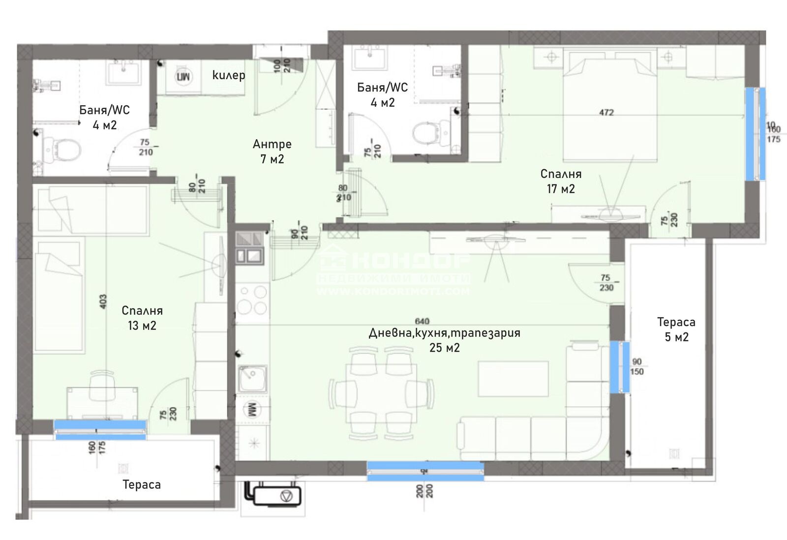 Оферта 67171:АКТ 16 !!!! Бутиков затворен жилищен комплекс с модерна и устойчива архитектура, потопена в богато озеленени площи, вдъхващи на живущите комфорт и спокойствие. Комплекса предлага просторна спокойна среда с бърз достъп до центъра на града, както и възлови булеварди. Предлагаме ви тристаен апартамент с просторна югоизточна дневна 25 кв.м. с трапезария и кухненска част, две самостоятелни спални: детска 13кв.м. и родителска 17кв.м., със собствена баня с тоалетна, втора баня, широко входно антре с място за гардероб, килер и две тераси. В близост са ситуирани ресторанти, хипермаркети, училища и детски градини. Изградени луксозни общи части с предоставено облагородено дворно място, пейки за отдих и детски площадки за игра. Апартаментите са издадени на: