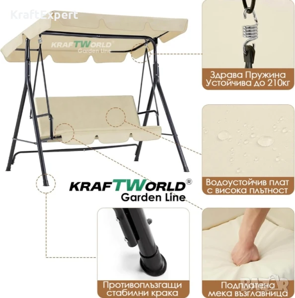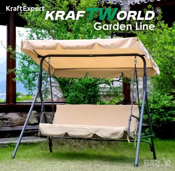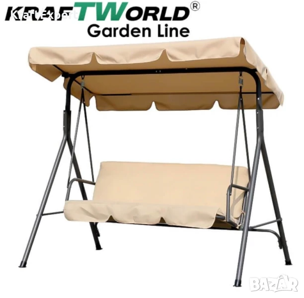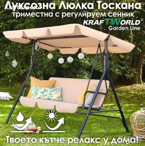 Градинска люлка Тоскана от KraftWorld – Триместна бежова люлка – усилена, стабилна и удобна, с подарък възглавница за сядане!🌿 Потопи се в спокойствие и комфорт с градинската люлка KraftWorld – модел Тоскана!Създадена за безгрижни моменти на отдих, тя съчетава стилен дизайн, функционалност и изключителна устойчивост на външни условия.💺 Подходяща за трима души, с впечатляваща товароносимост до 220 кг, тази люлка е идеалният избор за семейството или за споделени моменти с приятели.🪑 Изработена от лека, но усилена и стабилна метална конструкция (само 16 кг), тя е лесна за преместване и издръжлива на атмосферни влияния.☀️ Благодарение на регулируемия сенник, ще се наслаждаваш на сянка и защита от пряка слънчева светлина.🧺 В КОМПЛЕКТА ВКЛЮЧВАМЕ ПОДАРЪК – МЕКА ВЪЗГЛАВНИЦА ЗА СЯДАНЕ с дебелина 6 см, която не се предлага от повечето конкуренти! Докато други търговци предлагат стандартна платнена седалка, нашият модел осигурява допълнителен комфорт и мекота при всяко сядане, благодарение на тази качествена и водоустойчива възглавница.📏 С размери 170х110х150 см, люлката предлага просторно място за отдих, а нейният изчистен и елегантен стил „Toscana“ придава класа на всяко външно пространство.✅ Ключови характеристики:Товароносимост: до 220 кгУсилена метална конструкция – лека и стабилнаСенник срещу слънцеПОДАРЪК: мека възглавница 6 смРазмери: 170х110х150 смУстойчива на UV лъчи и влага✨ С люлката KraftWorld Тоскана ще превърнеш двора, градината или терасата си в любимо място за отдих и споделени моменти – с още по-голямо удобство, благодарение на включената възглавница.👉 Поръчай сега и се наслади на комфорт, който наистина се усеща с всяко люлеене!