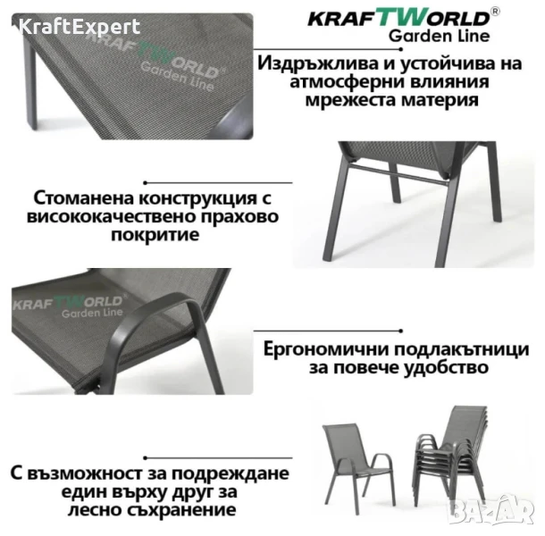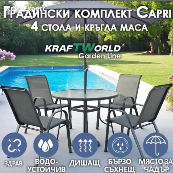 ✅ Комплект от 5 части: 4 стола и 1 кръгла маса✅ Здрава стоманена конструкция с прахово покритие✅ Текстилин седалки – дишащи и бързосъхнещи✅ Темперирано стъкло на масата за елегантен вид✅ Подходящ за външна употреба в градини, тераси и балкониПревърнете всяко открито пространство в стилен и уютен кът за отдих с градинския комплект Capri от KraftWorld Garden Line – съчетание от 4 удобни стола и елегантна кръгла маса. 🌿☀️Този комплект маса и столове за градина е създаден за онези, които ценят комфорта, стабилността и модерната визия. Идеален е за тераса, балкон, двор или заведение на открито, а също така пасва чудесно и в външна трапезария или кът за хранене на открито. 🏡🍴Столовете са с ергономичен дизайн – с висока облегалка и подлакътници, които осигуряват отлична поддръжка и релакс. Изработени са от здрава метална рамка с прахово покритие, която гарантира дългогодишна употреба без ръжда или деформации. Седалките са от висококачествен текстилин – материал, който е дишащ, бързосъхнещ и устойчив на атмосферни влияния. 🪑💧Кръглата маса със стъклен плот (Ø80 см) е стилен акцент в комплекта – с темперирано стъкло, което придава модерна визия и е лесно за почистване. Подходяща е както за ежедневна употреба, така и за събирания с приятели. 🍽️🥂📌 Размери на столовете: 54 x 72 x 96 см📌 Размери на масата: Ø80 x 70 см📌 Материали: стомана, текстилин, темперирано стъкло📌 Цвят: черна рамка, сив текстилен плат📌 Употреба: външна – градина, балкон, тераса, заведение, двор✅ Градинска мебел, съчетаваща функционалност и стил✅ Комплект 4 стола и маса – идеален за трапезен кът на открито✅ Устойчиви на влага, слънце и износване✅ Подходящ за дома и бизнеса – идеален за заведения на открито✅ Модерен градински сет с изискан дизайн и надеждна конструкцияС Capri получавате не просто комплект мебели, а завършено решение за вашето открито пространство. Насладете се на вечери под звездите, утринни кафета или следобедна почивка в обстановка, която излъчва елегантност и уют. 🌅✨💡 Изберете Capri – защото всяка градина заслужава своята история на комфорт и стил.