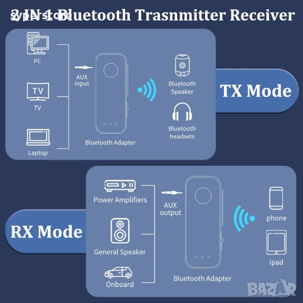 В режим приемник (RX) позволява старият ви музикален уред да приема поточно музика, изпратена чрез смартфон, таблет или лаптоп.