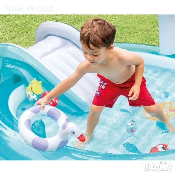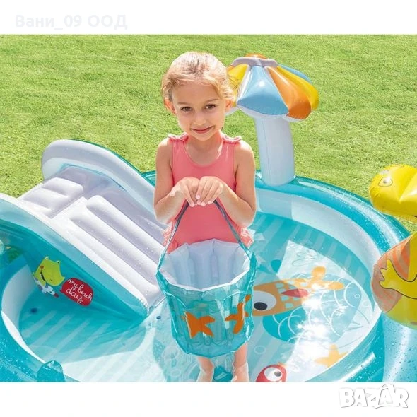 водна пързалка, сенник във формата на гъба, алигатор, пояс и кофа за риболов. Свържете градинския маркуч към пръскалката за вода и забавлението може да започне!