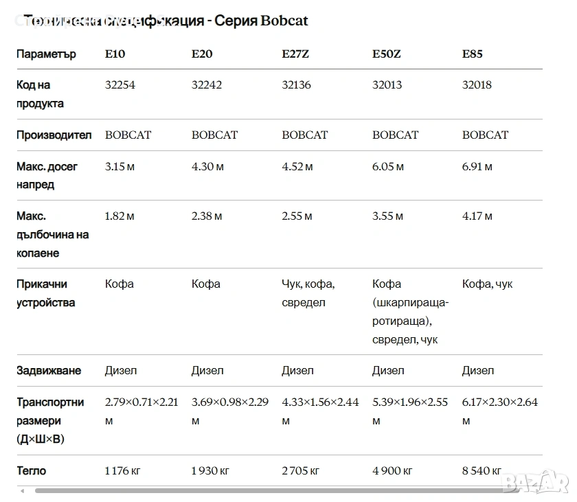Оборудването разполага с гумено-верижно задвижване и широка гама прикачни устройства - кофи с различни размери, свредла, хидравличен чук и други.