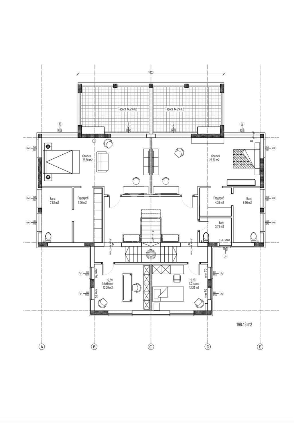 Втори етаж: четири стаи, две от които с гардеробна/дрешник, баня и тоалетна към всяка тях, както и една отделна баня с тоалетна за другите две стаи (като едната е предвидена за кабинет)