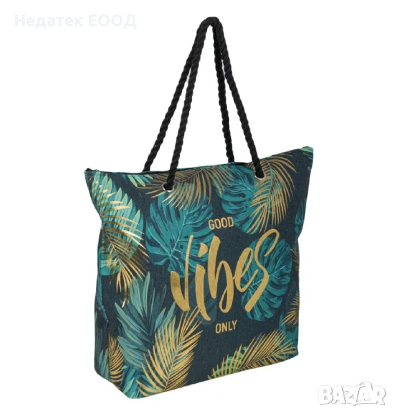 Лятна плажна чанта, зелена със златно фолио с надпис Good Vibes, цип, 25 см въжени дръжки и вътрешен джоб. Удобно побира кърпа, постелка, парео, бански и всичко останало, от което се нуждаете на плажа.