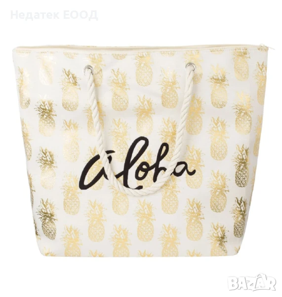 Лятна плажна чанта в бежово със златен мотив на ананас и черен принт "алоха", закопчава се с цип, има 25 см екрю дръжки от въже и вътрешен джоб.