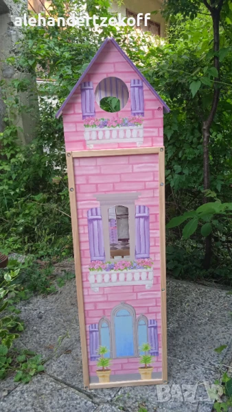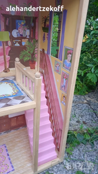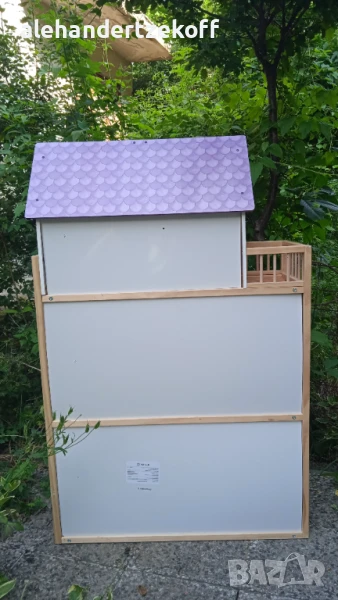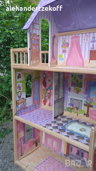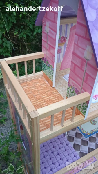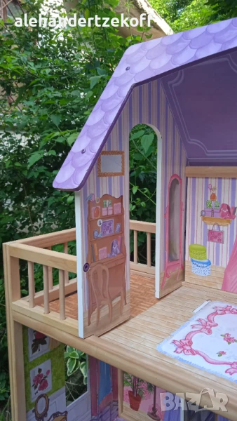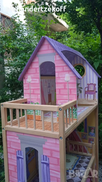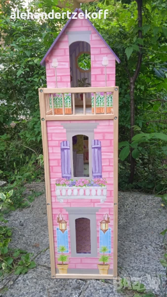 Къщата за кукли е висока - 115, широка -73 и с дълбочина 30 см - изработенa е от масивно дърво, конструкцията се характеризира с голяма издръжливост. Всички елементи са внимателно завършени, идеално полирани и безопасни за детето. Височината ви позволява да играете в удобна позиция дори за по-голямо дете. Освен това къщата е много стабилна - няма да падне върху детето, докато играе. Къщата е в отлично състояние видно и от снимките и очаква новите си стопани. Цената може да се коментира.