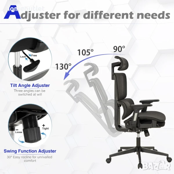 Компютърният / офис стол е с регулируема височина на седалката, облегалка за глава (60° регулиране отпред до гърба), облегалка (до 130°) и подлакътници.
