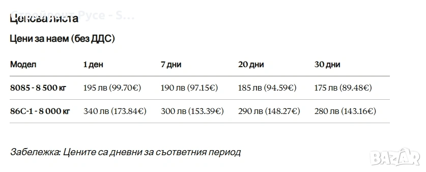 Цени за ден без включено ДДС