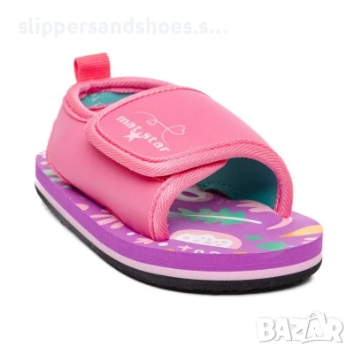 Тези детски сандали в розов и лилав цвят са с горна част от мек текстил и велкро закопчаване за лесно регулиране. Лилавата подметка е декорирана с пъстри графични елементи, а на розовите каишки е изписано "mat star". Удобни и практични за ежедневието.