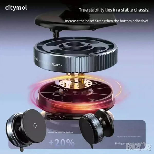Подобрената TPU вендуза може да издържи до 30% повече от това, което може да побере типична вендуза. Двуслойният неодимов магнит N52 създава силно сцепление.