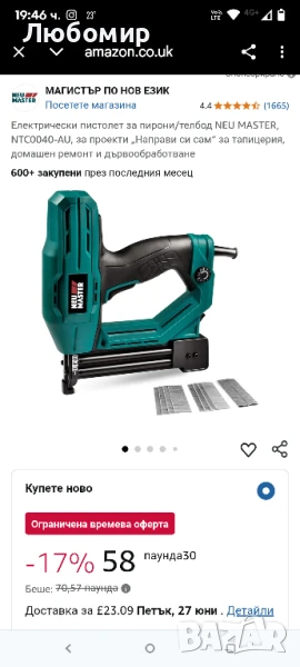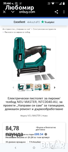 пистолет за пирони/телбод NEU MASTER, NTC0040-AU, за проекти „Направи си сам“ за тапицерия, домашен ремонт и дървообработване.Електрическият пиронник първо включете/изключете захранването, след това натиснете здраво предпазителя на контакта и накрая дръпнете лесно натискаемия спусък, за да работи правилно. Проектиран с троен заключващ механизъм за допълнителна сигурност и безопасност, той може да се съхранява безопасно у дома, дори ако има любопитни.Изключително практичен многофункционален 2 в 1 пирон за закрепване на телбод и пирони за закрепване. Работи с тесни телбод 5,8 мм от 15 до 25 мм и пирони за закрепване с калибър 18 от 15 до 32 мм.Уникален формат на щепсел BS (3-пинов) за по-добра употреба. Ненадраскващ се гумен нос осигурява безупречно покритие, а ергономичната дръжка осигурява удобен захват.Електрическият пистолет за телбод/пирофон е изработен от здрави материали за изключително издръжлива и дълготрайна употреба. Идеален за лична употреба и стотици „Направи си сам“ приложения, като например за закрепване на материали за телбод, кожа, картон, фолио и др.Работете с две ръце и натискайте горната част на електрическия телбод, за да забиете по-добре пирона напълно в дървото. (леко повдигнат край на около 5°.)