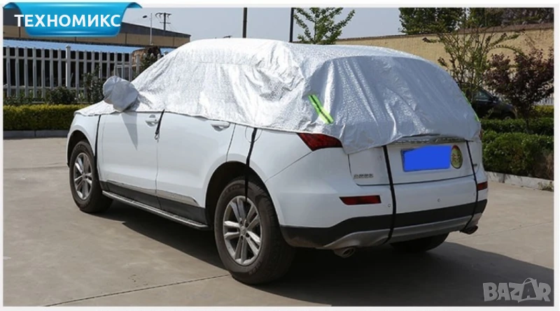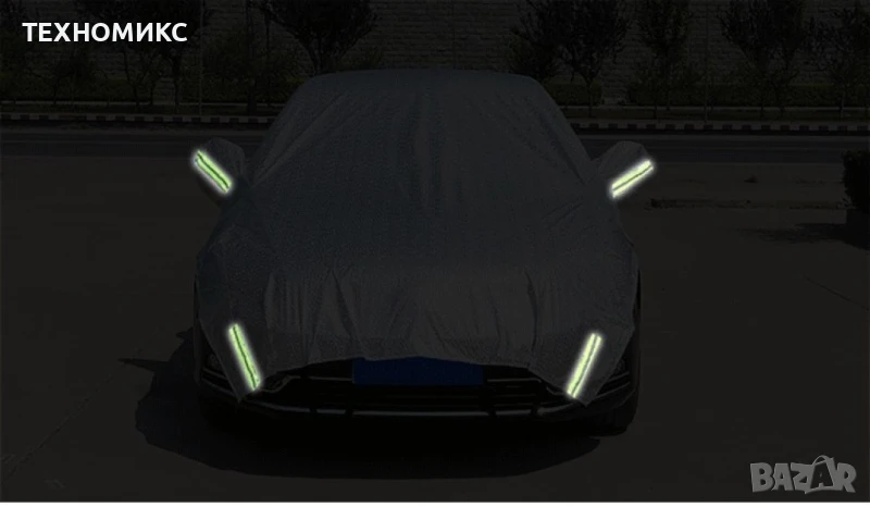 Колата се нуждае от защита, когато е извън гаража. Покривалото не покрива цялата кола, но е много функционално. Защитени са добре стъклата на колата и външните огледала. На външните огледала за задно виждане са предвидени „уши“, които са снабдени с светлоотразителни ленти. Надяваме се, че тези ленти ще предпазят огледалата от недобросъвестни шофьори, които разсеяно минават покрай колата ви. Покривката се разпъва много лесно с лентите, които се закачат с куки за джантите на колата.