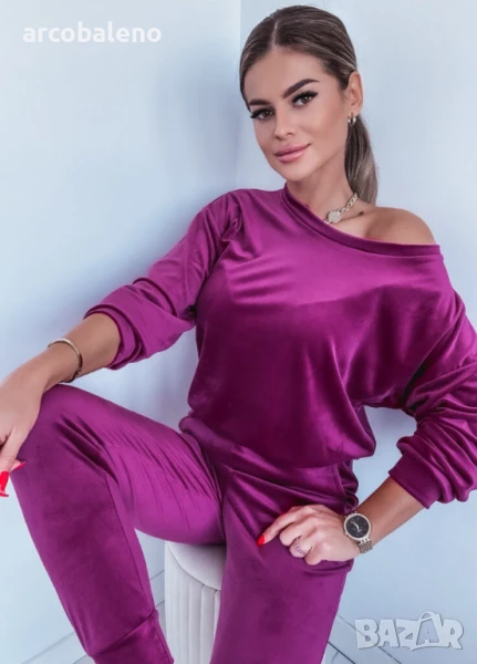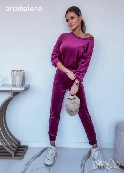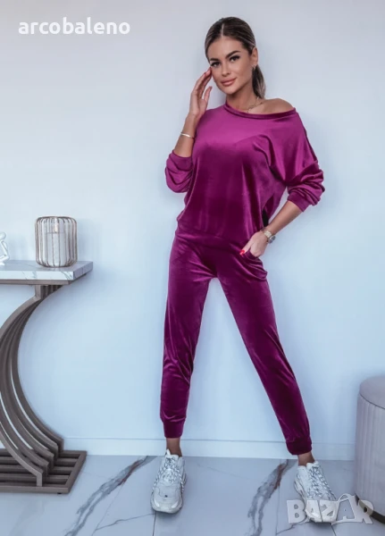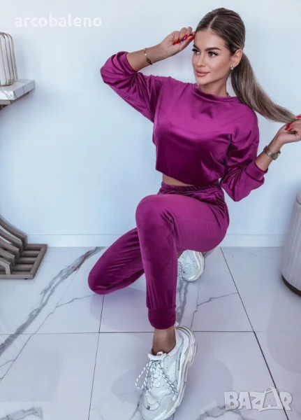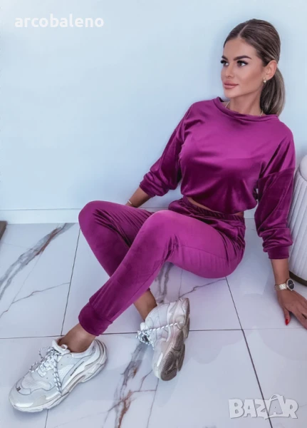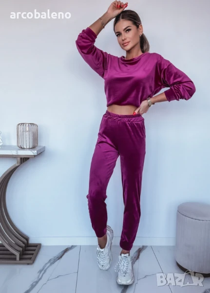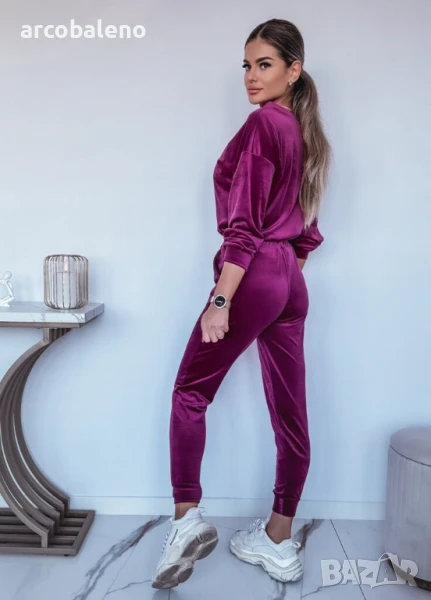 Детайли: Дамски комплект от велурени спортни дрехи. Суитшърт + панталон с ластик.