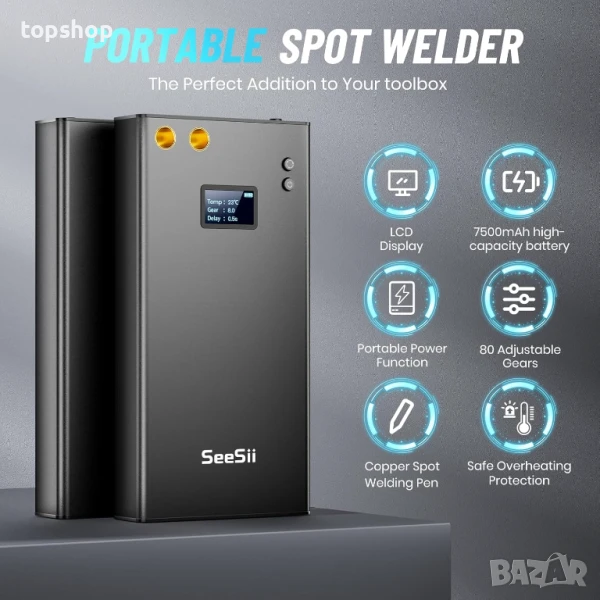 7500mAh акумулаторна батерия: Преносима точкова заваръчна машина Seesii с вградена високоскоростна батерия 7500mAh; Зарежда се напълно за 3 часа с Type-C кабел; Способна е да заварява хиляди точки с пълно зареждане; Също така, мини инструментът за заваряване може да зарежда вашия телефон.