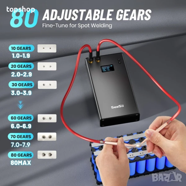 80 регулируеми предавки: Тази мини машина за точково заваряване с 80 регулируеми нива на мощност; Фина настройка между 1-8 и 1.1-5.4-8.0 предавки за прецизно заваряване, осигуряваща по-прецизно заваряване.