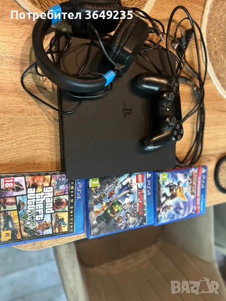 PlayStation 4 slim в добро състояние с кабели, слушалки, три игри и контролер