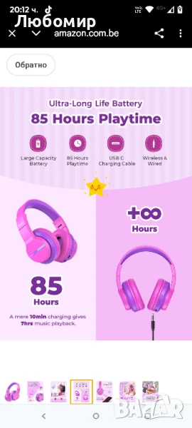 Стерео звук и ограничаване на силата на звука 74/85 dBA. Дори децата се нуждаят от добър звук, те ще харесат вградения 40-милиметров високоговорител, който осигурява богат бас и реалистичен звук. Ограничете силата на звука между 74 и 85 dBA, като използвате комбинираните клавиши, за да предотвратите случайно докосване на бутона за сила на звука. Нека децата ви се насладят на това, което чуват, с безопасна сила на звука.85 часа живот на батерията и зареждане през USB-C】С невероятния живот на батерията на детските безжични слушалки BTH12, празните батерии са нещо от миналото. Слушалките, оборудвани с батерия от 800 mAh, се зареждат невероятно бързо чрез USB-C кабел. Само за 10 минути имате 7 часа време за четене. Използвайте ги с AUX или безжично за максимална гъвкавост.