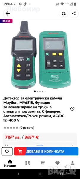Високо качество: кабелният детектор е компактен, здрав и издръжлив, удобен за носене. Ясният дисплей осигурява лесно четене. Предавателят и приемникът показват нивото на мощност, кода, батерията, вида и стойността на засеченото напрежение, както и алармата за високо напрежение.Функция за самотест: предавателят има функция за самопроверка, а предавателят и приемникът имат функция за заглушаване.12-400 V DC/AC измерване: чувствителността на приемника може да се регулира ръчно или автоматично. Измервател на напрежение DC/AC, вграден в трансмитера за линейно измерване на DC/AC напрежение 12-400V.Многофункционален кабелен детектор: Този кабелен детектор, който се използва широко в индустрията за комуникационни кабели, изграждане на електрически кабели, изграждане на тръбопроводи, телекомуникационни кабели, захранващи вериги и поддръжка на електрически проводници, е незаменим инструмент за поддръжка на персонала.Широко приложение: устройството е подходящо за откриване на кабели, електрически проводници, водопроводи/газопроводи, вкопани в стената или земята. Открива прекъсвания и къси съединения в кабели и електрически проводници, поставени в стената или в земята. Откриване на предпазители и задаване на вериги. Открива прекъсвания и къси съединения при подово отопление; открива случайно покрити контакти и съединителни кутии.Спецификации:Диапазон на измерване на напрежение: предавател: AC/DC 12V-400V.Изходен сигнал: Предавател: 125KHzНапрежение: емитер макс. AC/DC 400V.Измерване на дълбочината на кабела: приемник 0-2,5 m (стенен/заземен кабел).Измерване на основно напрежение: приемник 0-0,4 mРаботна среда: предавател и приемник: 0 ~ 40 ℃Температура на съхранение: предавател и приемник: -20 °C ~ 60 °C.Относителна влажност (без кондензация): предавател и приемник: макс. 80%Батерия на предавателя: 1 x GL6F22A 1604A батерия (не е включена).Батерия на приемника: 6 бр x 1,5 V AAA LR03 батерия (не е включена)Дължина на тестовия кабел: прибл. 1,5 м / 4,9 фута.Дължина на тестовия щифт: прибл. 12,3 см / 4,8 инча.Размер на основния прът: прибл. 22,7 x 11 см / 8,9 x 4,3 инча.Размер на предавателя: прибл. 24,3 x 7,7 x 3,5 cm / 9,6 x 3 x 1,4 инча.Размер на приемника: прибл. 19 x 9 x 4 см / 7,5 x 3,5 x 1,6 инча.Приблизително тегло: 1373 g / 48.4 oz.Детектор за електрически кабели Mayilon, MY6818, Функция за локализиране на тръби в стената и под земята, С фенерче, Автоматичен/Ръчен режим, AC/DC 12~400 V