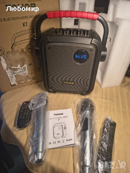 Tonor Караоке Пълен Bluetooth високоговорител с 2 безжични микрофона за пеене, караоке машина Преносим звуков високоговорител с микрофони Поддръжка TWS AUX вход USB/TF за парти дейности K7.HD стерео качество на звука: Не се заблуждавайте от малкия му размер, нашата караоке машина осигурява мощен звук въпреки компактните си размери. Bluetooth високоговорителят разполага с 5,25" нискочестотен високоговорител и 2" високочестотен високоговорител, които осигуряват впечатляващ звук без изкривяване, дори при висока сила на звука. Насладете се на отчетливи високи честоти, балансирани средни честоти и мощен бас, които вдъхват живот на музиката ви! Идеален за малки срещи, училищни събития, тренировки и срещи.