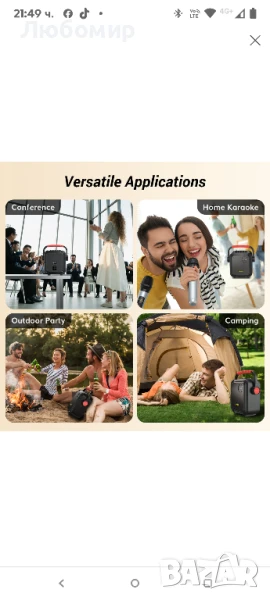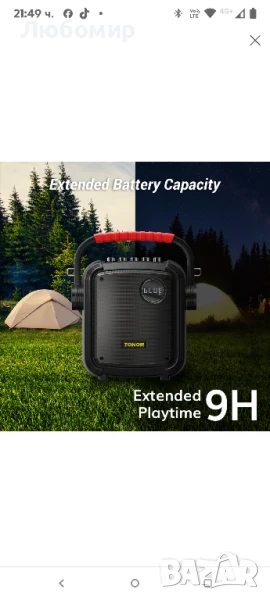 ДЪЛЪГ ЖИВОТ НА БАТЕРИЯТА Нашият Bluetooth високоговорител се захранва от акумулаторна литиево-йонна батерия с капацитет 5400mAh и осигурява до 9 часа непрекъснато възпроизвеждане на музика. Ако имате нужда от повече време за възпроизвеждане, можете да оставите високоговорителя включен в електрическата мрежа по време на употреба, за да можете да слушате музика и да зареждате едновременно. Така че нашата караоке машина е проектирана така, че купонът да може да продължи цяла нощ.