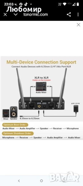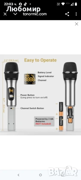 Лесен за работа: Просто включете приемника и микрофоните, те ще се съгласуват автоматично. Забележка: Не е съвместим с лаптоп, iPad, мобилен телефон и AV приемник. За всеки микрофон са необходими 2 x AA батерии (не са включени).
