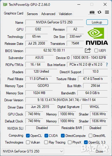Продавам Видео карта NVidia GeForce Asus ENGTS250 HDMI 1024MB GDDR3 256bit PCI-E