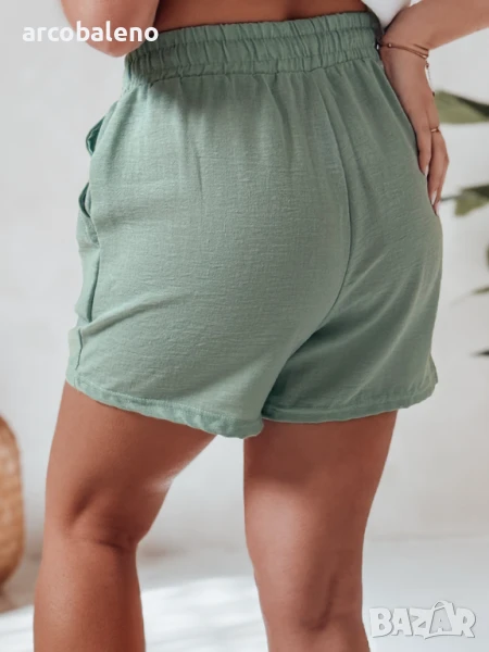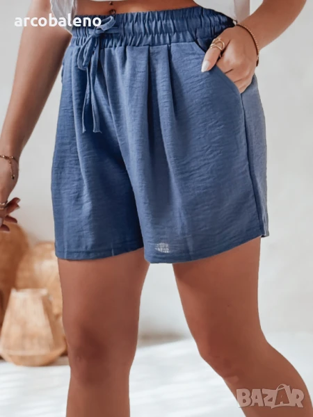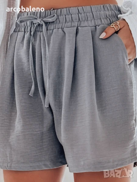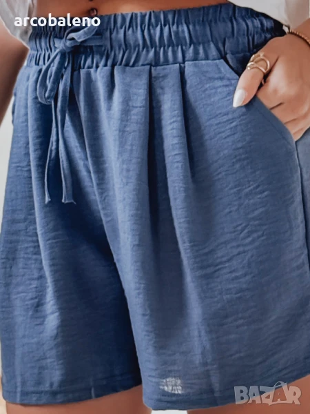 Леките, свободни дамски шорти с висока талия са комбинация от лекота и стил. Завързвани на талията с връзки и снабдени с ластик, те гарантират комфорт през целия ден. Два джоба отпред добавят очарователен характер, а леката материя прави модела идеален за летни дни и ваканционни пътувания.