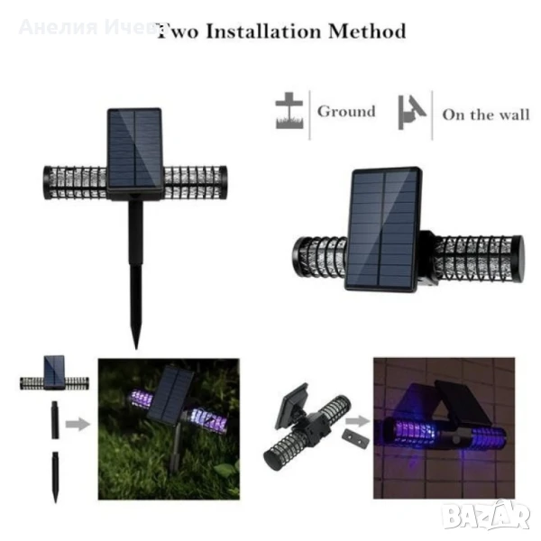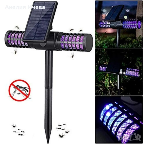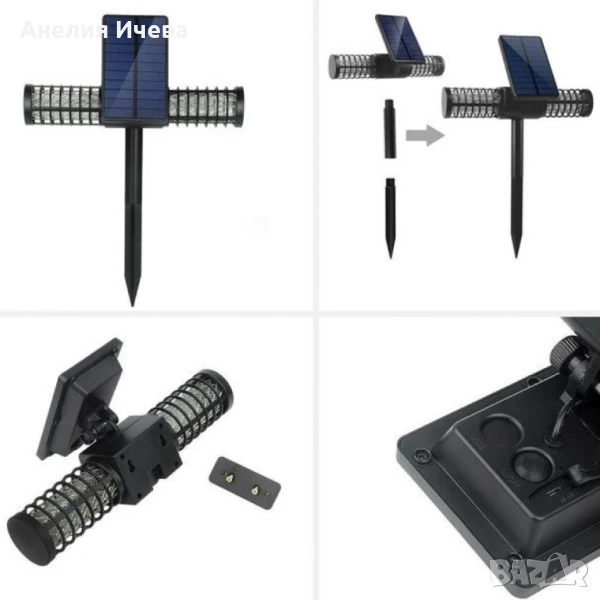 Соларна лампа против комари. Материал - здрава пластмаса и ел. компоненти. Обхват - 1-2 акра. Литиева батерия 18650. Капацитет на батерията 3.7 V, 2000 mAH. Сертификат за водоустойчивост IP65. Издръжливост - до 10 часа. Светлинен източник 4 бр х 5 мм UV и LED диодни крушки. Възможност за зареждане на ток чрез USB кабел. Безшумна. Копче ON/OFF. Вградена предпазна решетка. Комплектът включва - 1 бр. лампа срещу комари, 2 бр. тръби на държащо рамо, 2 бр. винт, 1 бр. кабел за зареждане, 1 бр. стойка-планка за стена и ръководство за употреба. Гаранция - 12 месеца.