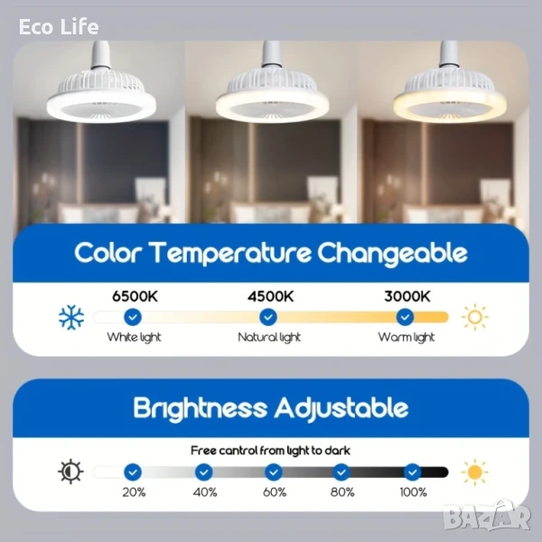 Интелигентно дистанционно управление: Оборудван с дистанционно управление, нашето устройство ви позволява да регулирате не само осветлението, но и интензивността на въздушния поток според вашите нужди. С три степени на осветление, три скорости на вентилатора и удобна функция за таймер, можете да персонализирате вашата атмосфера с едно натискане на бутон.