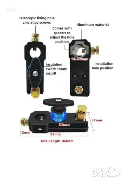 Универсалният прекъсвач за акумулатор е предназначен за бърз монтаж и безопасна употреба.Изработен от устойчива ABS пластмаса и медни конектори, прекъсвачът осигурява надежден контрол върху електрическата система на превозното средство, предотвратява разреждането и удължава живота на акумулатора. Основни характеристики:Материал на корпуса: ABS пластмасаКонектори: масивен медЦвят: черен с елементи в синьо и месингРазмери: 104 x 32 x 46 ммРаботно напрежение: 12V и 24VМонтаж: директно върху положителната клема на акумулатораСъвместимост: автомобили, камиони, микробуси, мотоциклети, кемпери, лодки и др.Предимства:Удължава живота на акумулатора, като прекъсва захранването при паркиранеПредотвратява случайно разреждане и къси съединенияПозволява лесен достъп при поддръжка или подмяна на акумулатораНе са необходими допълнителни кабели или инструментиЛесен монтаж, подходящ както за професионалисти, така и за любители Комплектът съдържа:1 × Прекъсвач за акумулатор2 × Метални дистанционни втулки2 × Монтажни винта Забележка: Съвместим с клеми на акумулатори с диаметър между 10 и 20 мм.Проверете съвместимостта преди монтаж.Код IN0384