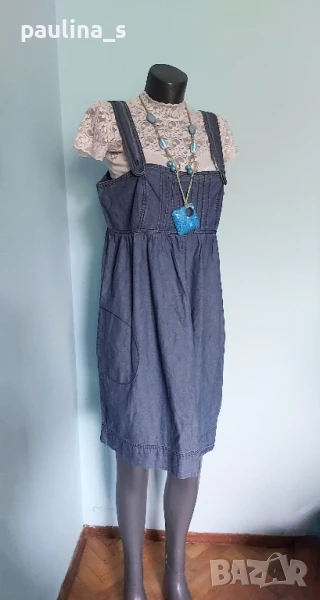 2️⃣. L / XL - "Estelle". Цената е крайна 34,99лв / 17 евро. Син дънков сукман от фин Деним, без еластичност. Моделът е с високо поставена платка и разкроение. Има ластици отзад, закопчава се с цип в страни. Джобовете са в страничните тегели и маркирани отпред. Не е нов, но е без дефекти. Герданът не влиза в цената.