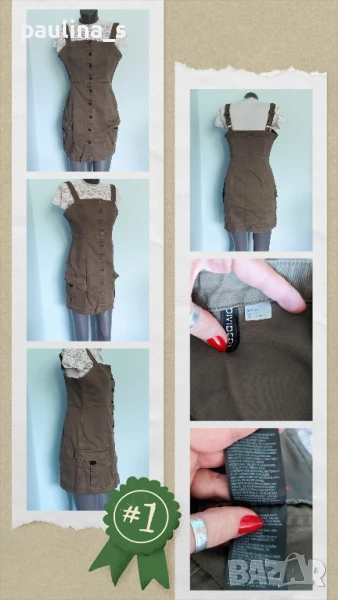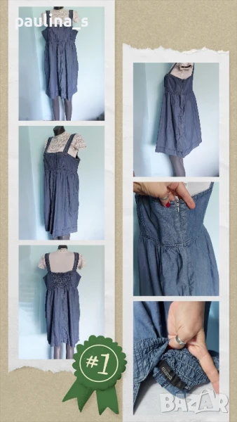 4️⃣. Колаж / L / 2XL - "H&M". Цената е крайна 39,99лв / 20 евро. Много готин дънков сукман с избелващ ефект и джобове. Материята е памук и ликра, еластична и покрива няколко размера - 44 европейски стандарт. Цветът е Зелен / Шам фастък / Милитъри. Сукманът е нов, без дефекти и етикет.