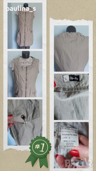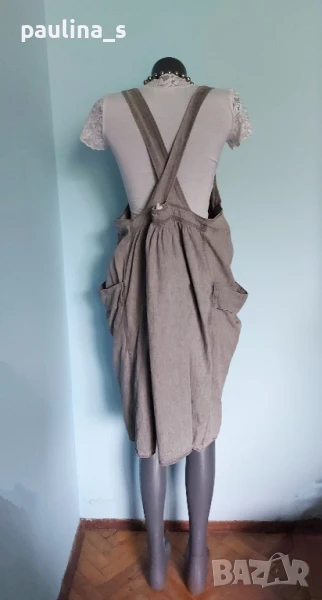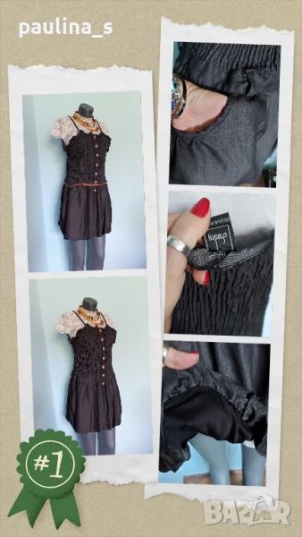5️⃣. Колаж / L / XL - "Ofelia". Цената е крайна 49,99лв / 24 евро. Винтидж! Рядка находка! Уникален сукман много интересен модел с обемни външни джобове с капаци и закопчаване с кукички. Цветът е неопределим, като сиво. В зоната на ханша стои обемно, долу завършва с обратни басти. Платът съдържа метални нишки и стои фабрично измачкан, без еластичност. Ципът е метален и тъмен, надежден и здрав. Уникална дреха, вече не се произвеждат такива.